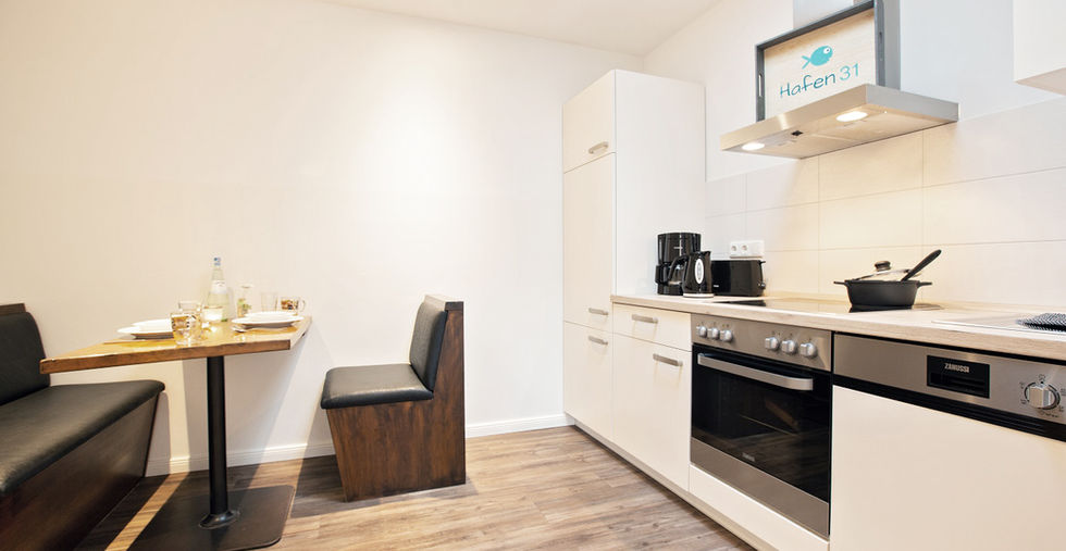 Küche inkl. Kühlschrank, Herd, Backofen, Geschirrspüler, Wasserkocher, Toaster und Filterkaffeemaschine